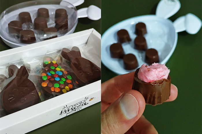 Meus destaques foram: Ovo Ovomaltine, Cenoura de Chocolate Recheada com Bolo de Cenoura, Pavê de Cerejas com Oreo e Strudell de Maçã com Uvas Passas! Um que me surpreendeu também foi o bombom recheado com algodão doce!